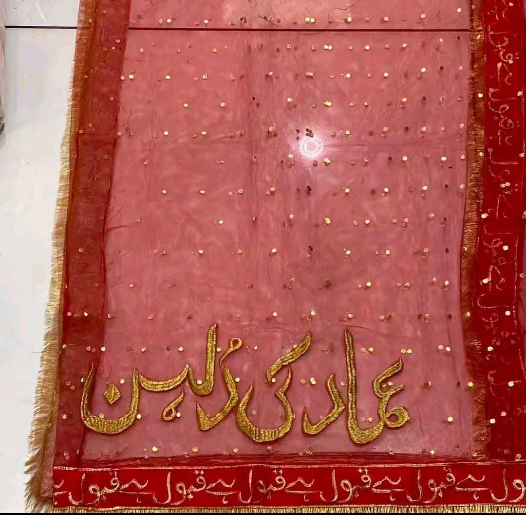 This exquisite bridal dupatta is crafted from luxurious net fabric, adorned with intricate hand embroidery and shimmering zari work. The delicate border features detailed sequins and pearl embellishments, adding a royal charm to your wedding look. Lightweight yet grand, it perfectly complements both traditional and contemporary bridal ensembles.